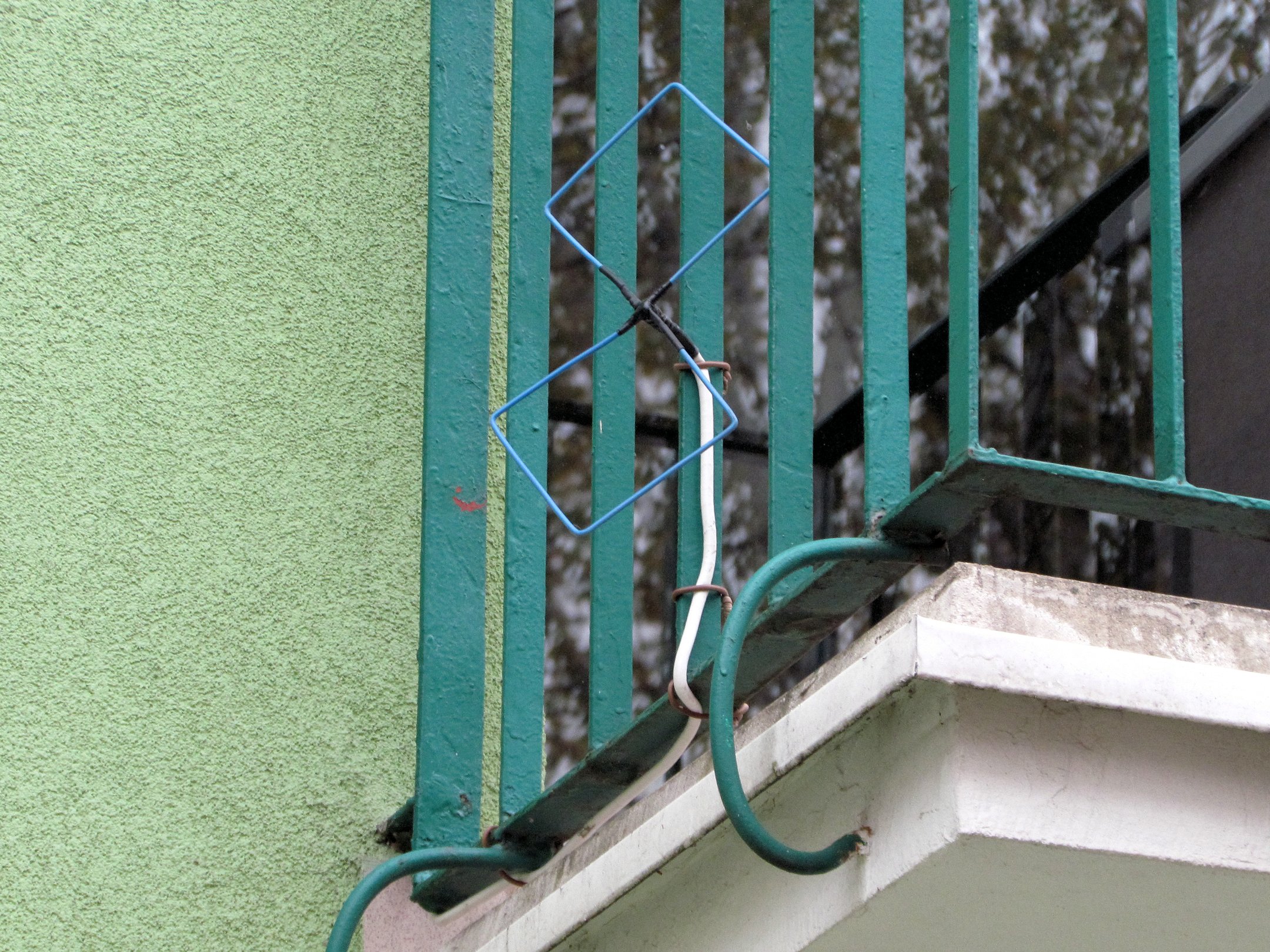 Nie eksperymentowałem z ekranem/reflektorem, ponoć w wielu przypadkach poprawia to parametry i tłumi niepożądane sygnały z tyłu oraz poprawia kierunkowość anteny. W mojej konstrukcji wydało się to zbyteczne, siła sygnału jest wysoka, a usytuowanie blisko ściany bloku niejako zapewnia w dużym stopniu tłumienie pobocznych zakłóceń. Zauważyłem, że balustrada w jakimś stopniu spełnia rolę siatki i ekranu, bo w tej pozycji i odległości na jakiej zamontowano antenę walory odbiorcze były najlepsze. Przesunięcie między słupki czy oddalenie od balkonu skutkowało różnymi efektami.