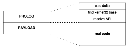 Na początek może kilka słów jak wygląda typowy shellcode. W sieci ciężko coś znaleźć sensownego na ten temat. Najczęściej shellcode można podzielić na kilka elementów - prolog (header) i payload. I to w sumie niezależnie od systemu.