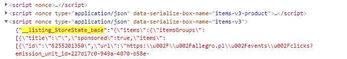 Taka ciekawostka, ten nieszczęsny obiekt bazowy, który do tej pory leżał gdzieś w kodzie JS strony tak naprawdę nie zniknął definitywnie. Przebrandowano go na jakiś JSON-owy kod i zapewne nadal jest wykorzystywany przy tworzeniu i manipulowaniu bazową listą aukcji (tą widoczną) po bezpośrednim załadowaniu strony.