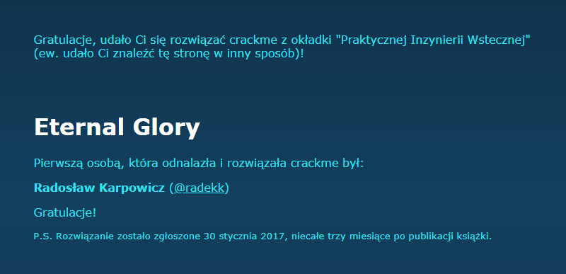 To już pewnie koniec hackowania książek. Możliwe, że gdy uda mi się kiedyś zdobyć te książki fizycznie, albo trafić na jakieś ebooki, to poszukam pozostałych flag i easter eggs przemyconych w treściach książek. Bo jak sam autor wielokrotnie wspominał, kilka ich gdzieś tam czeka na odkrycie ;)